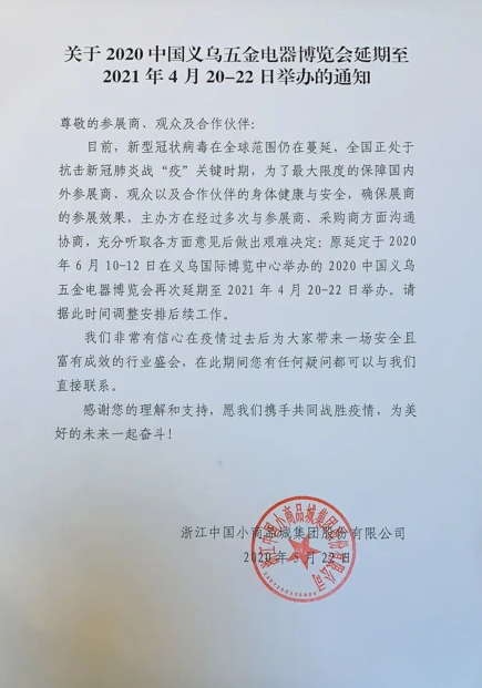 2020中國義烏五金電器博覽會原延定于2020年6月10-12日舉辦,在充分聽取各方意見后,為確保參展成效和安全,將再次延期至2021年4月20-22日舉辦,感謝您的理解和支持。